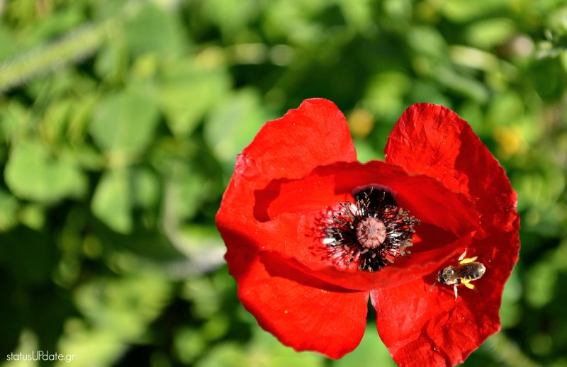 Στη φωτογραφία κάποιος βλέπει τη μέλισσα που έχει ξεμυαλιστεί από την κατακόκκινη παπαρούνα. Αυτός προσπαθεί να κλέψει τη στιγμή παρατηρώντας με ήρεμες κινήσεις.